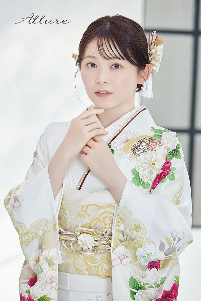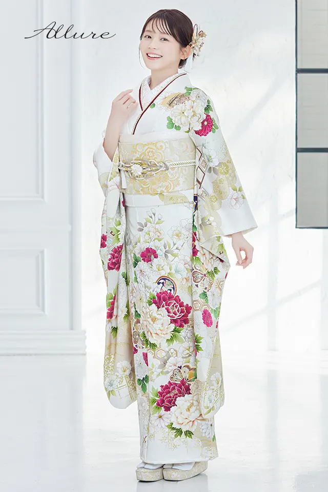 全体を白でまとめポイントにワイン系のカラーを効かせた古典柄でありながら可愛らしくモダンな印象の振袖です。全体的に施した金加工とポイントの刺繍が立体感と豪華さを引き立てています。