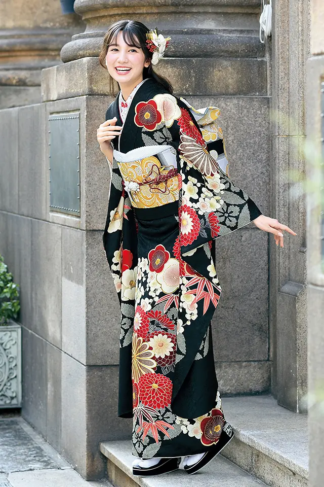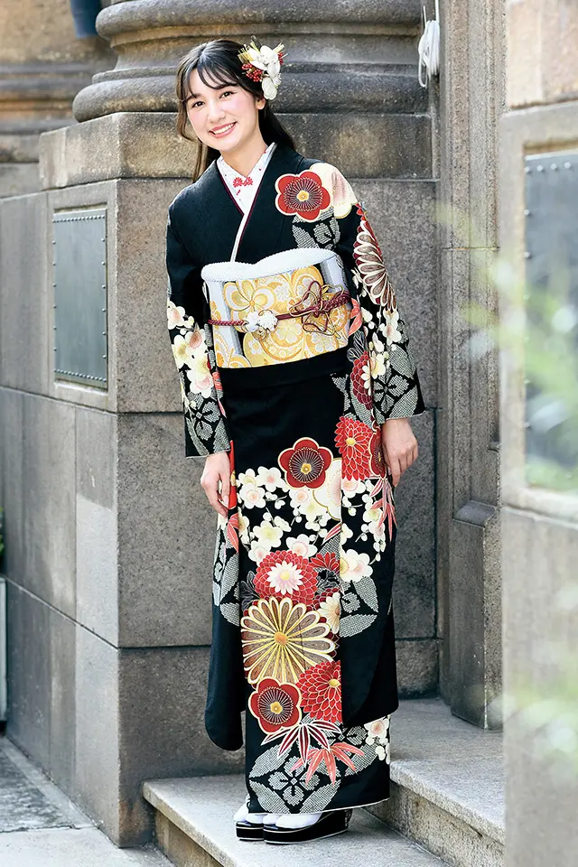 黒地に赤の挿し色が華やかな振袖です。疋田柄で描かれた七宝花菱柄を背景に菊をメインに梅・椿・笹等の草花が描かれています。レトロな佇まいの古典柄振袖です。