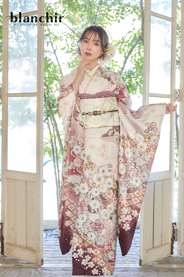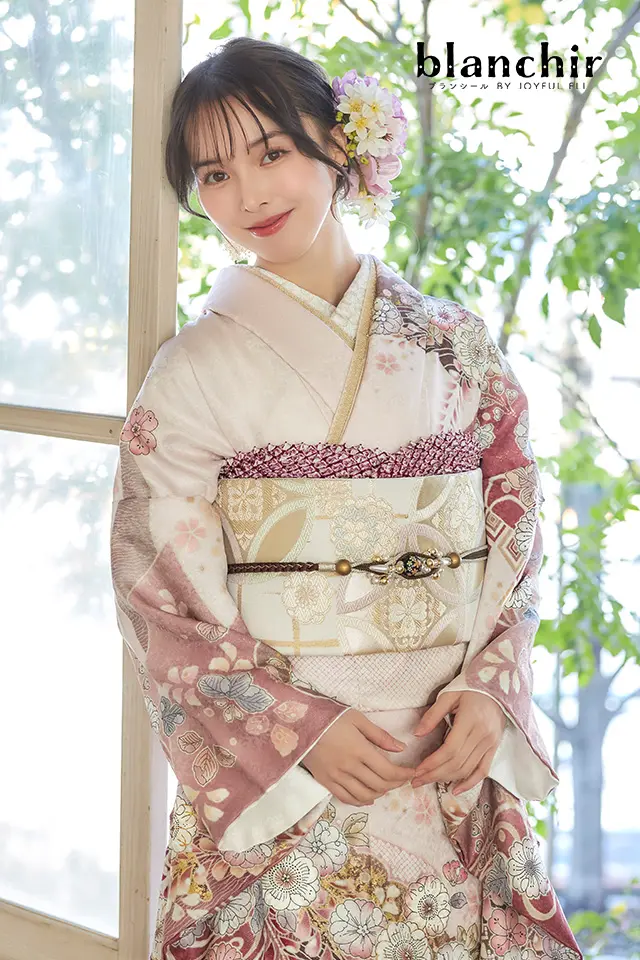 全体に散りばめた桜の花が愛らしく、淡いピンクが上品な印象の辻が花振袖です。
