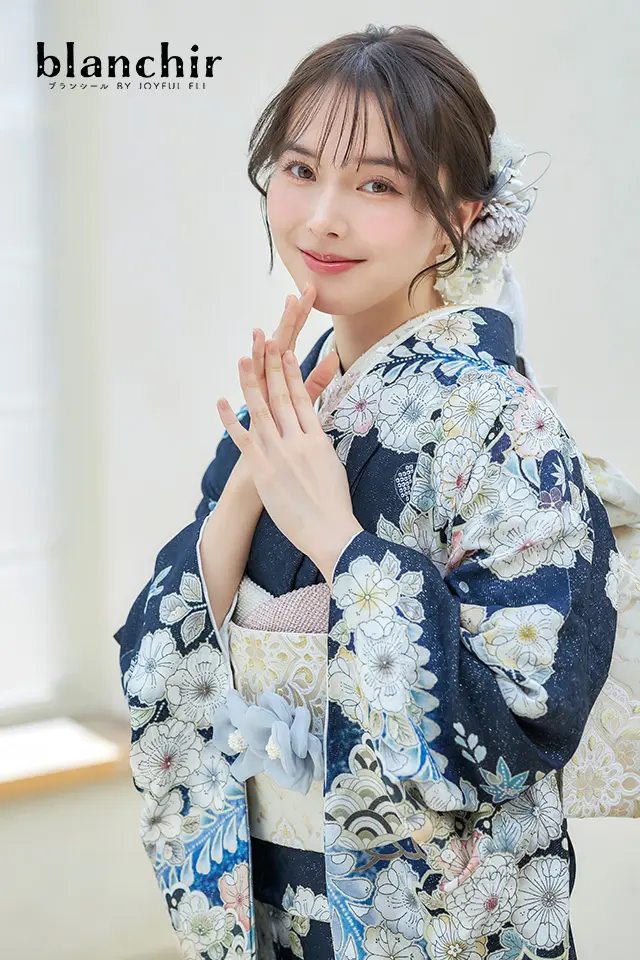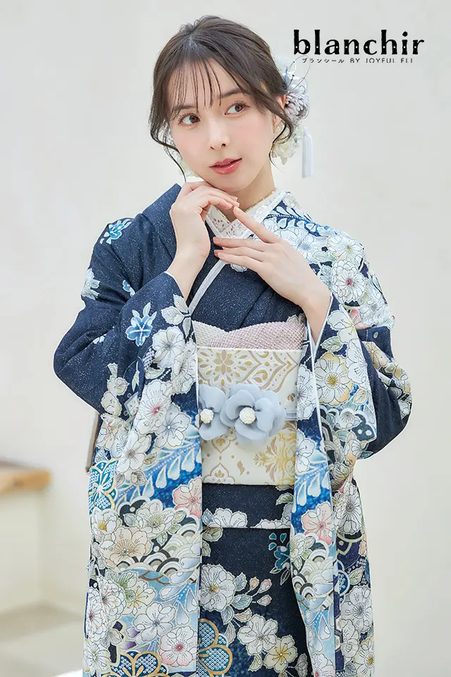 ダークネイビーの地色に白を基調とした配色が爽やかな印象の辻が花振袖です。