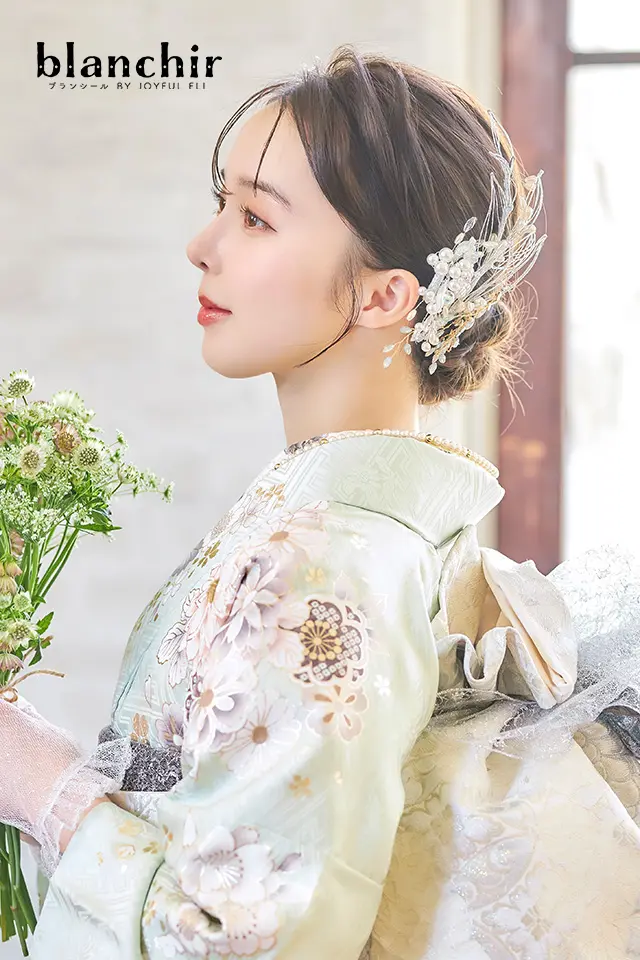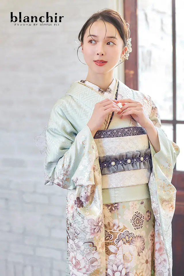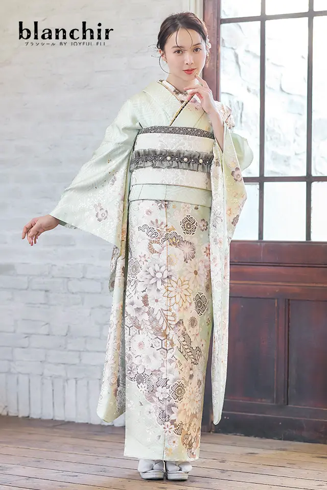 淡いミントグリーンの地色に白を基調とした柔らかな配色で透明感あふれる上品な着姿の格調高い古典振袖です。
