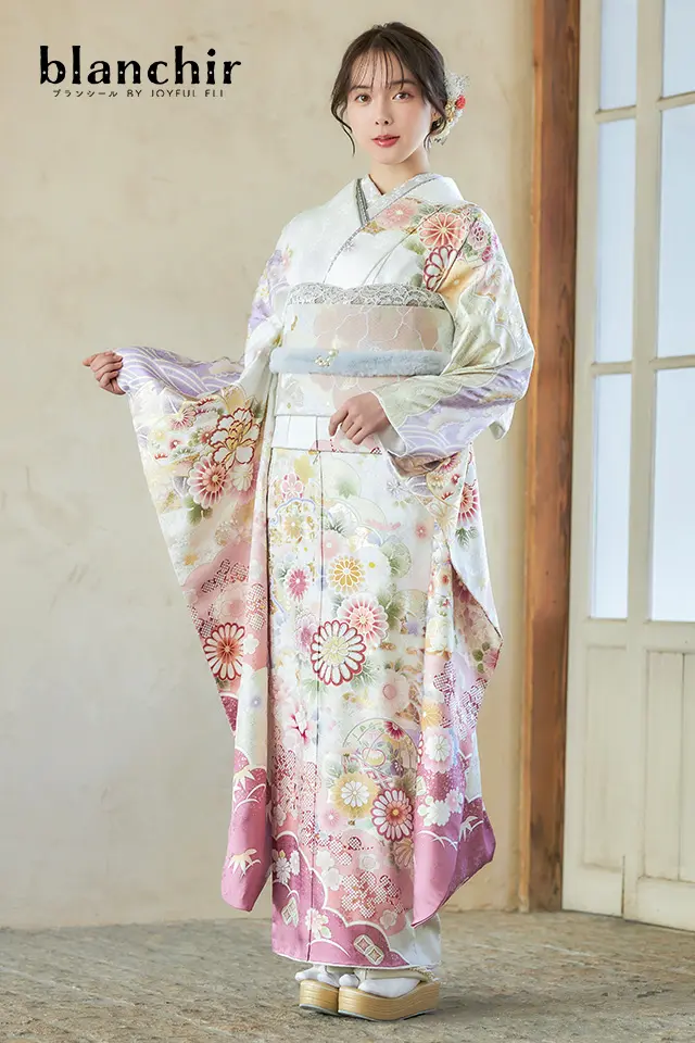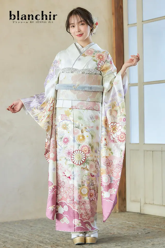 格調高い吉祥文様を甘く優しい色使いで染め上げた可愛らしさ満載の古典振袖です。