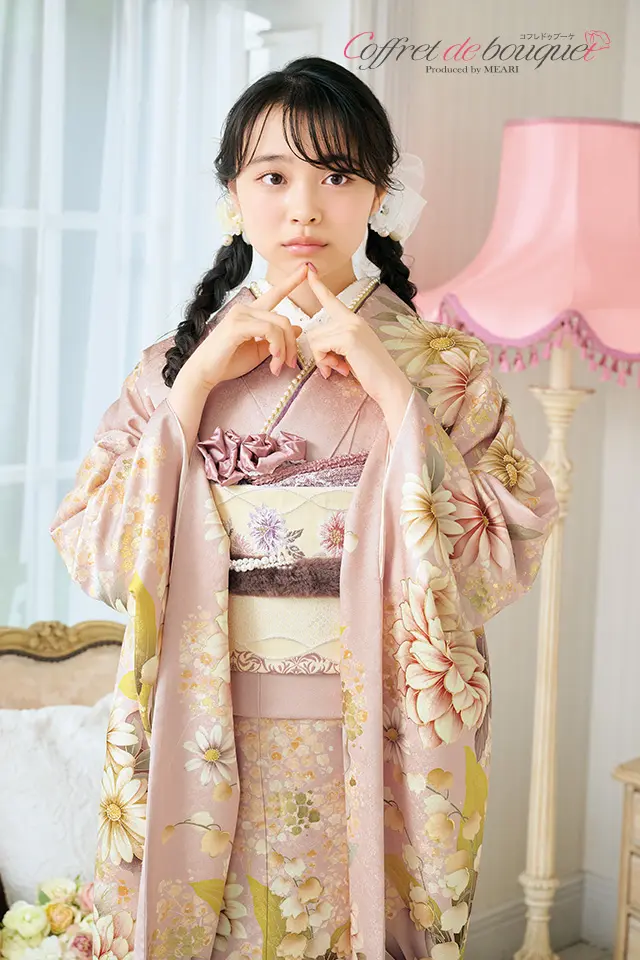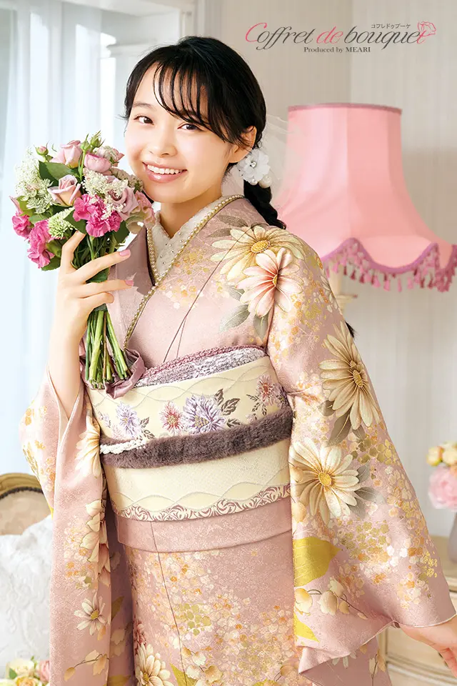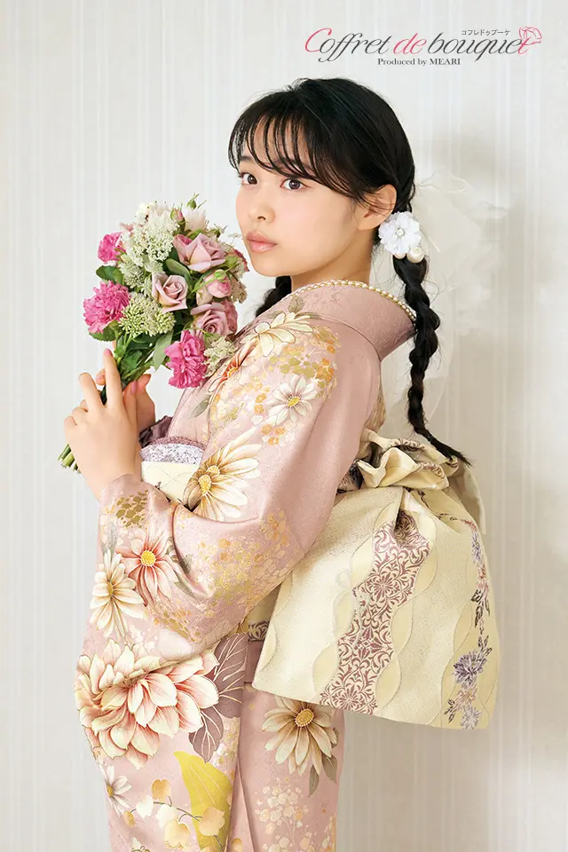 全体に広がるカスミソウが印象的で、ダリヤ・スズラン・マーガレットの花々が可憐に描かれています。あしらいのリボンの柄が可愛らしさを一層引き立てます。ピンクベージュを基調とした色合いは落ち着きがあり優し気な印象です。