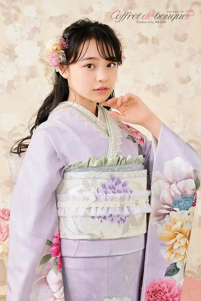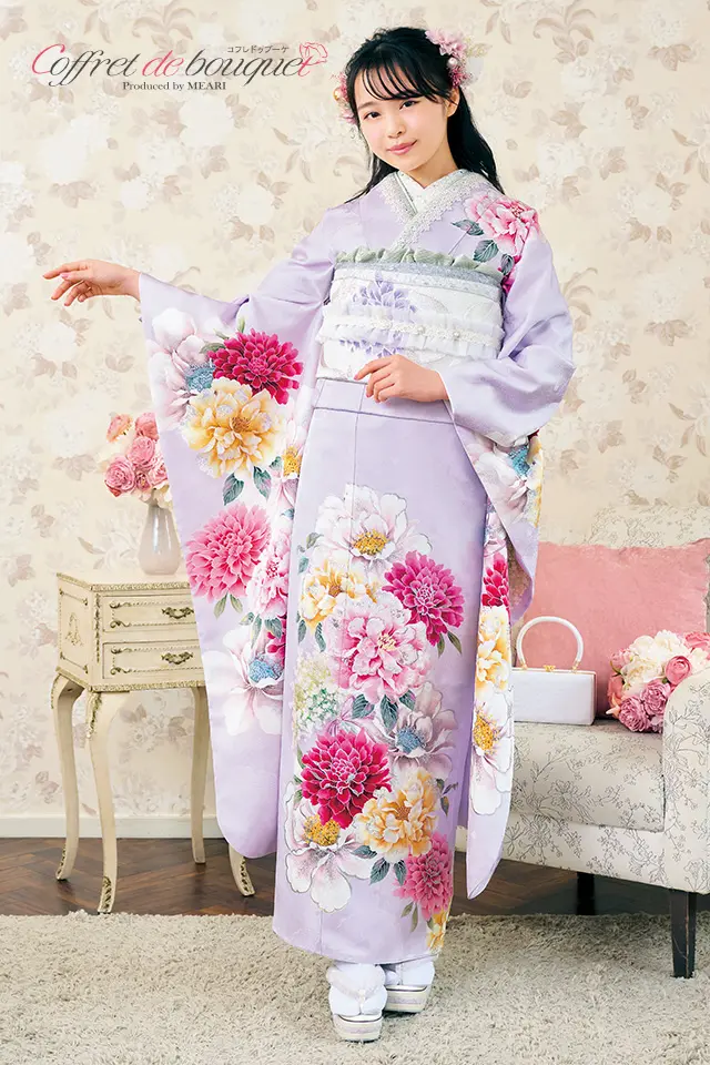 ダリヤ・カスミソウなどの洋花で構成されたまるでブーケのような振袖です。淡いピンクラベンダーの地色にローズカラーや黄色のアクセントを効かせた花々がフェミニンで優しい雰囲気を演出します。