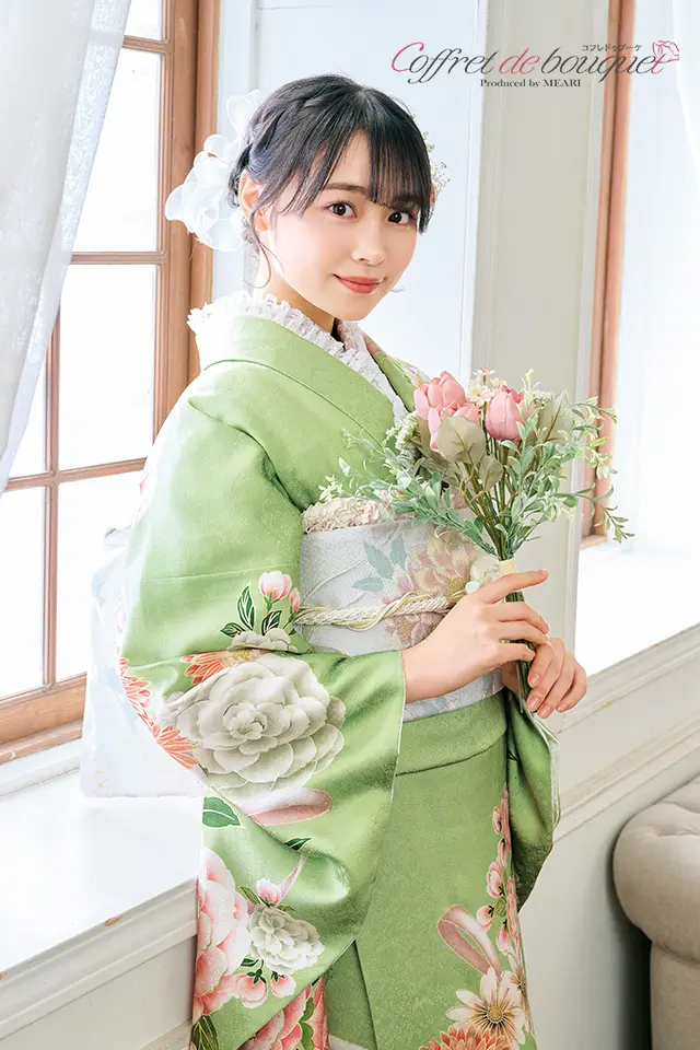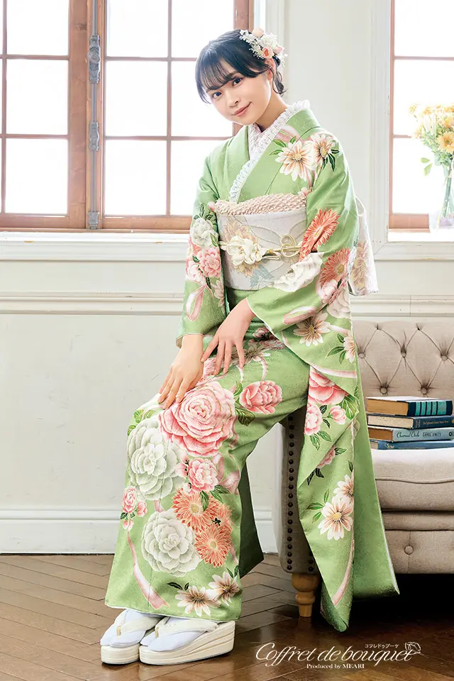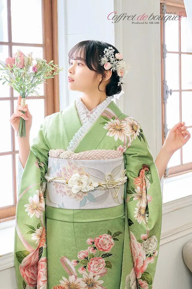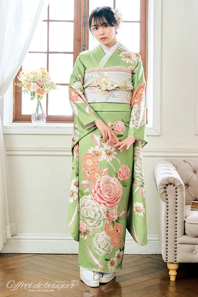 春を感じさせるやわらかなグリーンの地色にバラやガーベラ、マーガレットの花々とピンクのリボンが描かれた可愛らしさ全開の振袖です。