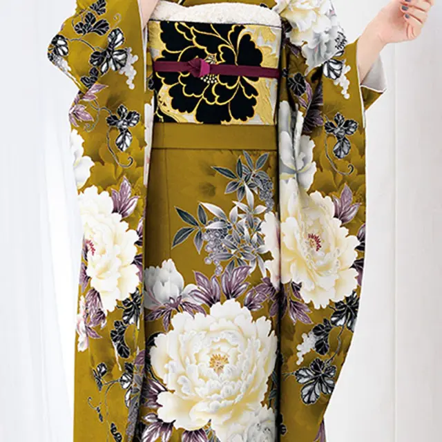 金茶の地色にメインの牡丹を配し、南天と葡萄の柄が印象的な振袖です。地色に馴染ませた牡丹や葉はビターな配色ですが、白い牡丹で明るさと華やかさを演出しています。銀箔と刺繍の加工により、立体感と艶感が強調された仕上がりとなっています。