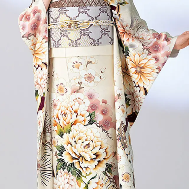 優しいアイボリーの地色と満開の花々が調和する清楚でかわいらしいカラーリングに、立体感のある牡丹や針松がアクセントとなる凛としたき姿に仕上げました。肩から裾にかけての流水取り、重なるように描いた梅の花が柄に動きと流れを生み出しています。
