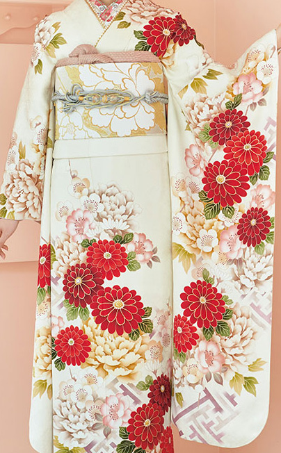 アイボリーの地色に赤系の菊を右肩山から流れる様に配した草花古典柄の振袖です。メインの花々に添えた白系の桜や牡丹の花々がボリューム感を生み出し、背景に大きく描いた紗綾形が古典美を際立てています。