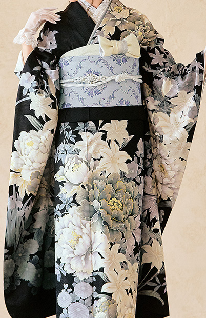 百合や牡丹といった艶やかな大輪の花のモチーフを黒や白中心の配色でモダンに仕上げました。背景には蔦を濃淡であしらい幻想的な奥行きを出しています。華やかな意匠でありながらシックな色使いでまとめた斬新な振袖です。