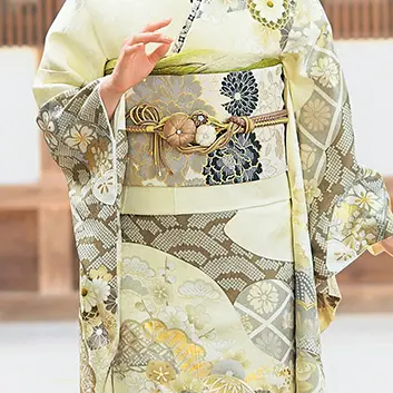 流れのある道長取の中にいにしえよりお目出たいとされてきた吉祥文様を配した重厚な古典柄振袖です。姿・色・形が愛されてきた菊に、松は常に緑を保ち、いずれも女性の美に対する象徴として特に振袖には多く使われる柄になります。配色は思い切って色彩を淡いベージュのトーンで統一し、今までの古典友禅には無いモダンなイメージを持った振袖となっています。
