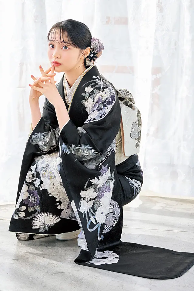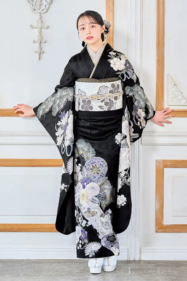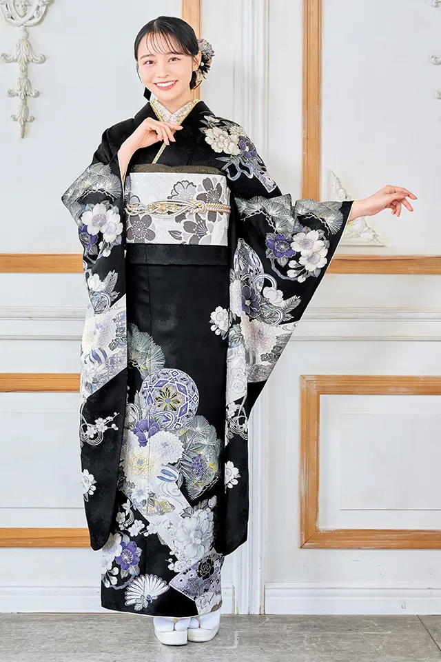 古典柄の代表格である菊の花を重ねた文様に桔梗や松を合わせ、背景に毬や水引をあしらい、よりデザイン性を高めています。