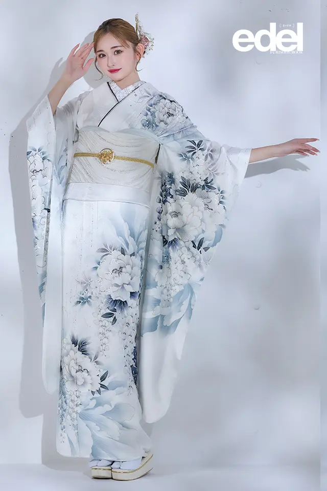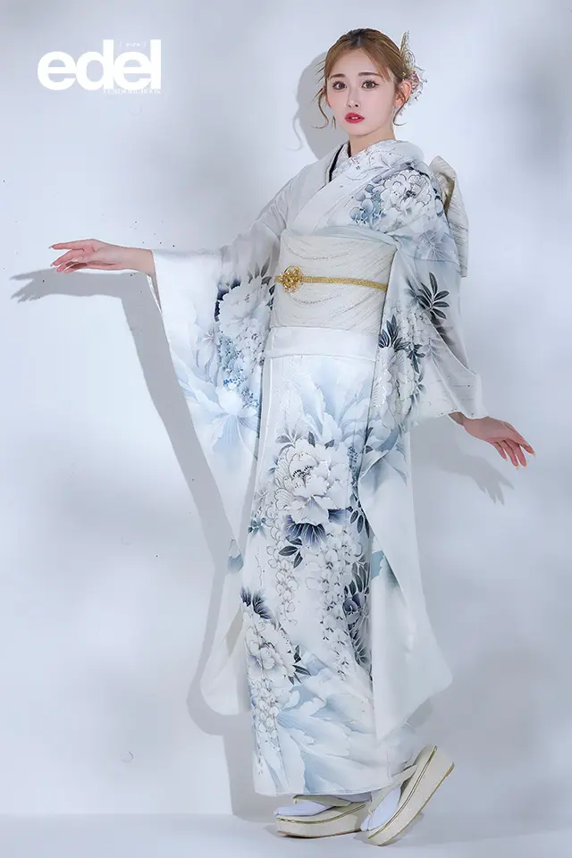 牡丹・藤などのモチーフをモダンな配色でまとめました。襟元などに施された煌めくラインストーンが艶やかで洗練された着こなしを演出します。