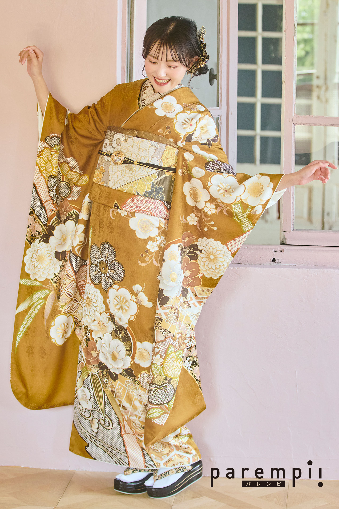 椿や梅・菊・笹などの草花を散りばめ背景や裾に配した疋田や源氏香の柄が格調高い古典柄へアップデート。全体の色を統一することで落ち着いた印象の古典柄振袖です。