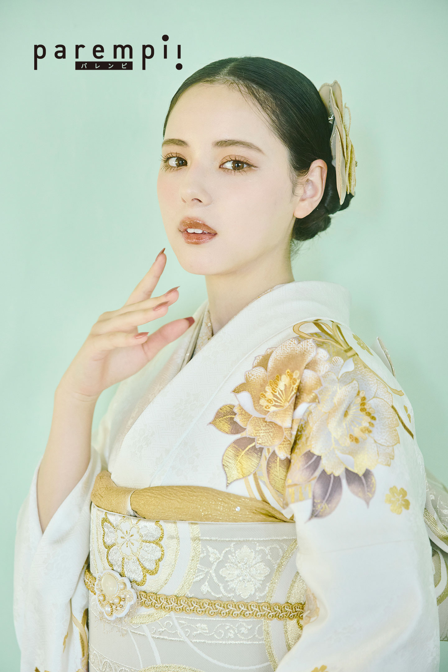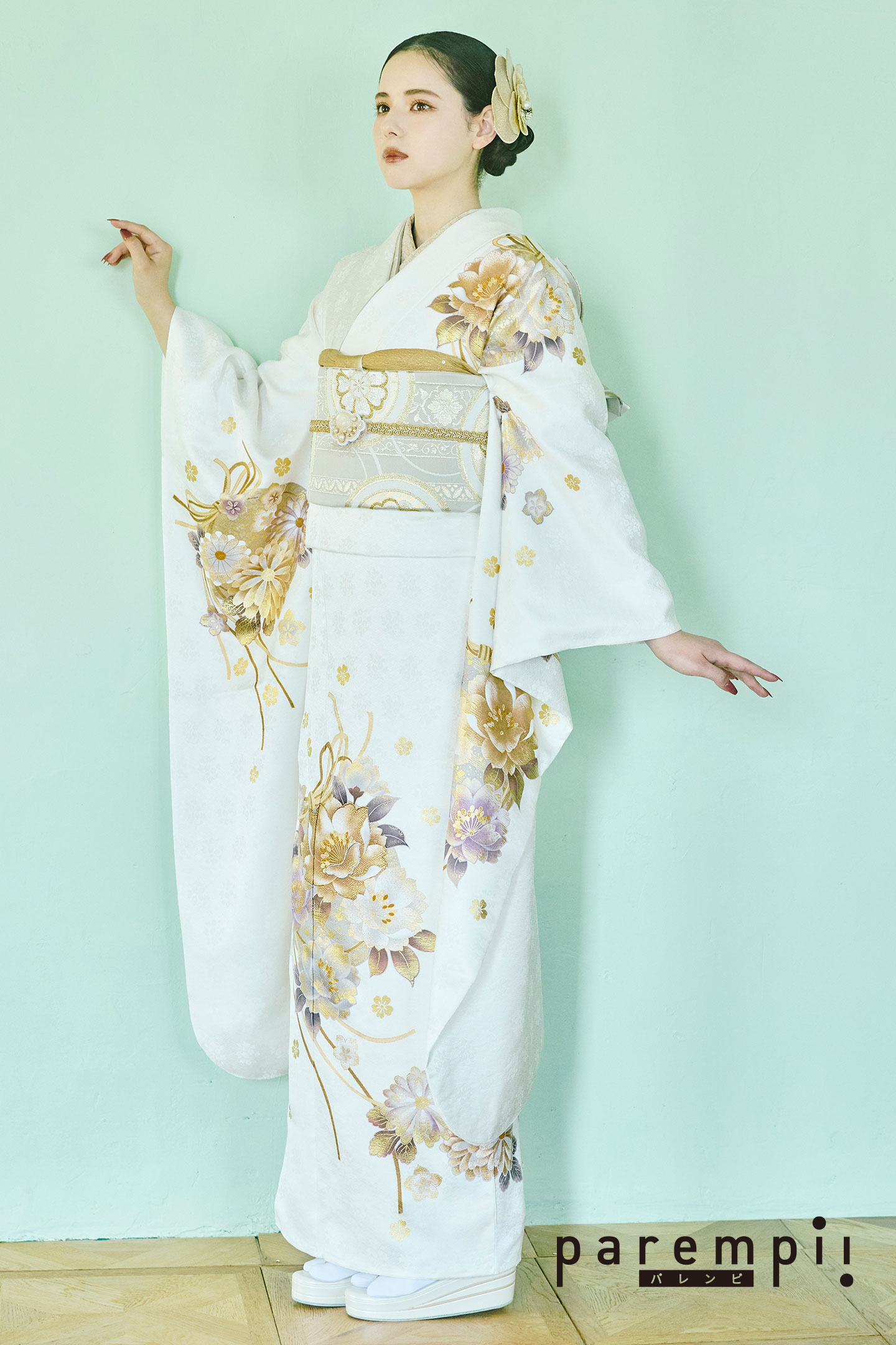 清潔感溢れる純白の地色のポイントに配した桜花紋を金彩友禅で表現したシンプルなデザインに金彩の華やかさが引き立つ上品な印象の振袖です。