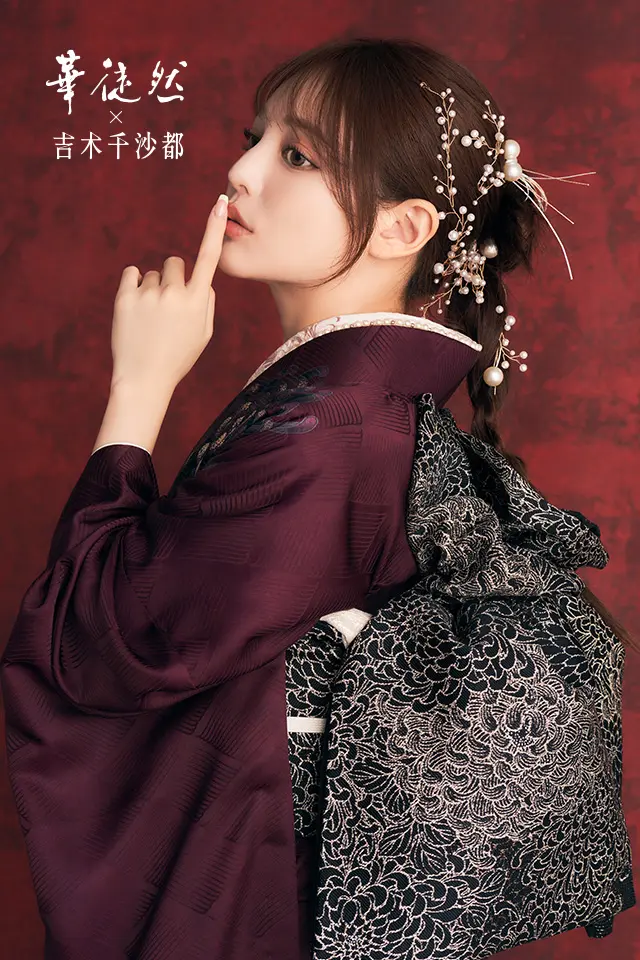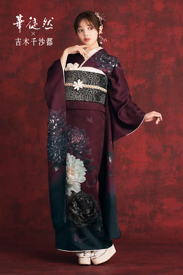 大輪の白・墨色牡丹をメインモチーフに水墨調の乱菊や蝶の柄ですっきりした表情に仕上げた古典モダン振袖です。アンティークなボルドーカラーの地色に、墨色の繊細な濃淡や色目にこだわった色調が重厚な印象を感じさせます。