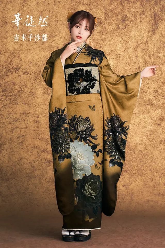 大輪の白・墨色牡丹をメインモチーフに水墨調の乱菊や蝶の柄ですっきりした表情に仕上げた古典モダン振袖です。渋みのあるゴールドのような琥珀色の地色に、墨色の繊細な濃淡や色目にこだわった色調が重厚な印象を感じさせます。