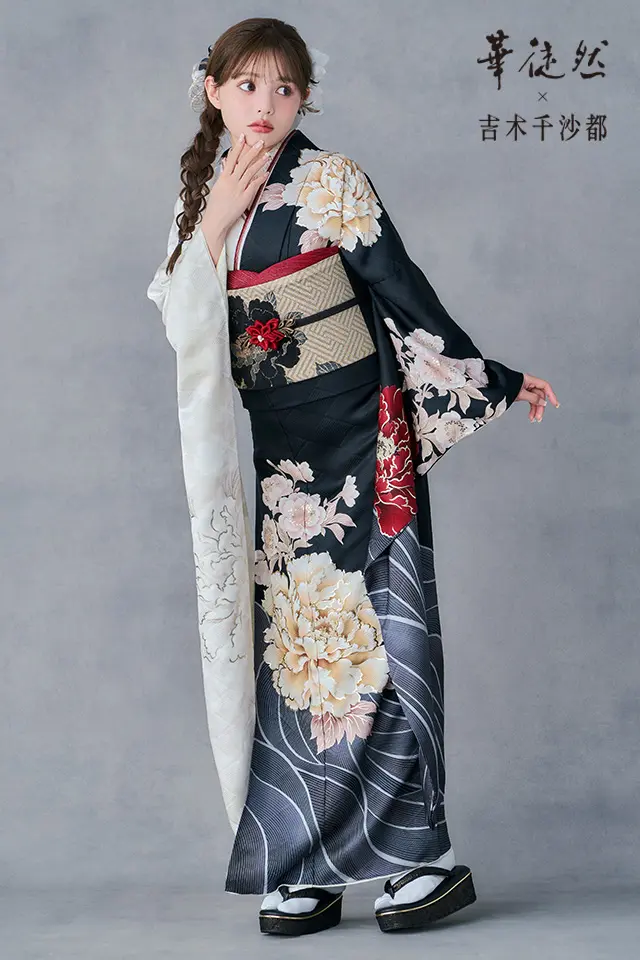大胆な牡丹とモダンにデザインされた流水がシンプルで粋な印象の振袖です。