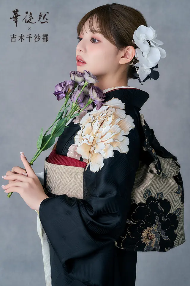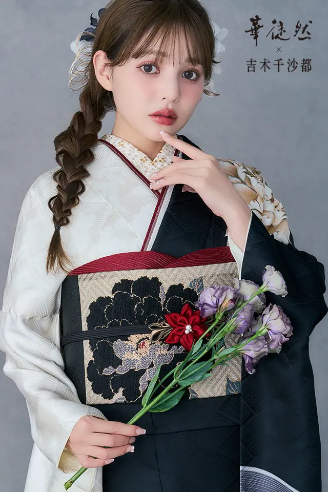 地色は白と黒に染め分けられ、白を基調とした花々とポイントとなる深紅の色使いが洗練された美しさを表現しています。