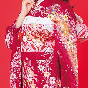 まるで絵本の世界から出てきたようなメルヘンな色合わせのキュートな振袖です。牡丹や桜、コスモスなどの女の子らしさを強調する花たちがギュッと敷き詰められた柄は、思わずお出かけをしたくなるような気持ちに。