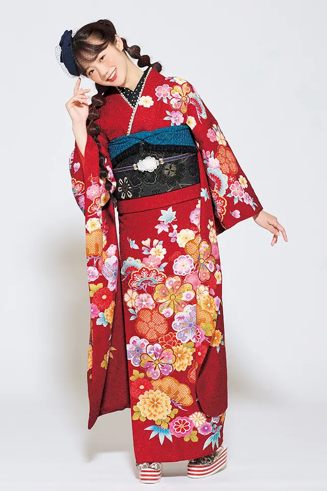 大きく縁取った桜の中に冬を連想させる色合いで雪輪と松を配し、全体にはピンク色の小花を印象的に散りばめた春の訪れを感じる振袖です。ピンクや赤色の小物で可愛らしくコーデするも良し、山吹やヒワ色で王道古典を貫くも良し。お好みのスタイルを選んで。