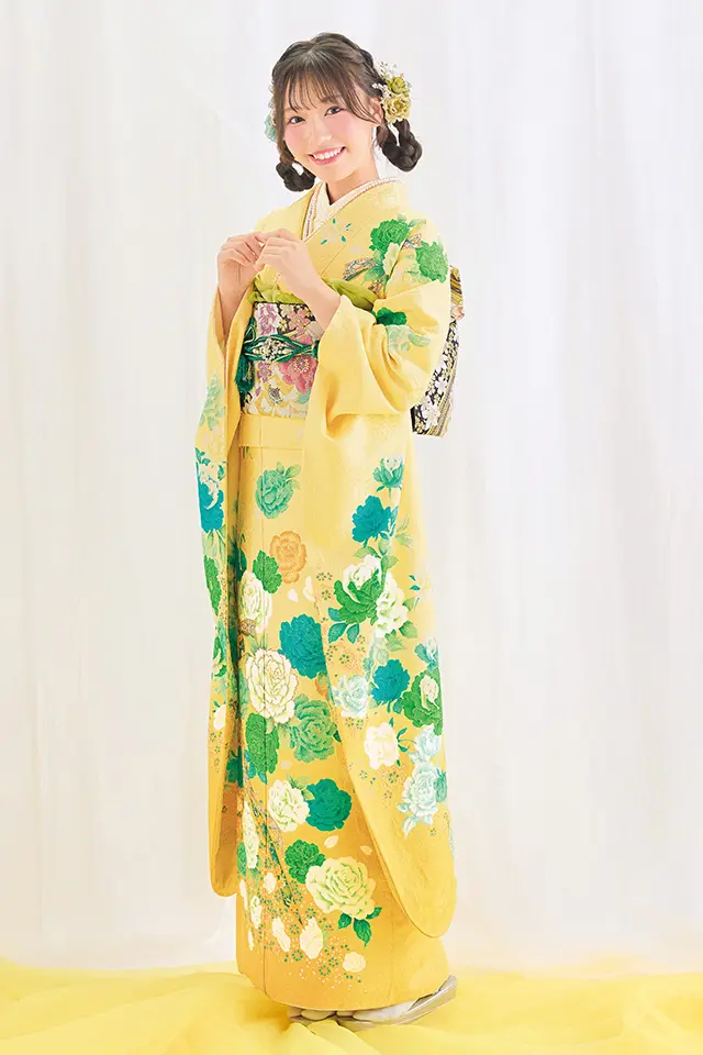 友達と被りたくない!そんな願望を叶える為に、思い切って大輪のバラ柄はいかが?一見すると派手に感じる柄も、優しいイエローの地色に類似した色合いの緑や青で統一感を持たせる事により、トライしやすい振袖となっています。