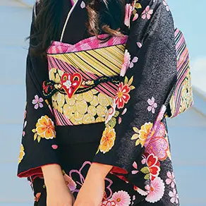 はんなりとした着姿にレトロ要素をプラスし、美白効果のある黒い地色と対照的な可愛らしい色味の柄が相まった良いトコ取りな振袖です。白やピンクのボカシが軽やかな雰囲気を作り出し、浮かび上がるように配した桜の花たちが心躍らせます。