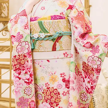 温かみのある白地にピンク色の濃淡で彩られた花々が、ふんわり夢心地のキュートな振袖です。みんなから愛され続ける桜と、百花の長とも呼ばれる牡丹や季語としても親しまれているコスモスたちが肩を並べ、特別な時間を笑顔にします。