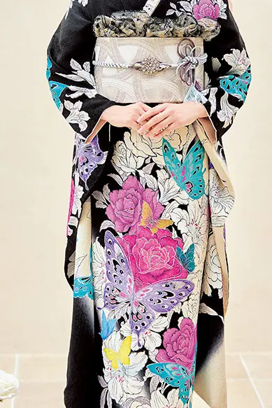繊細なタッチで描かれたバラと百合がクールで新しい感覚の振袖です。華やかに舞う蝶たちは古くから長寿のシンボルとして多くのファンから愛され、唯一無二の魅力をプラスしています。