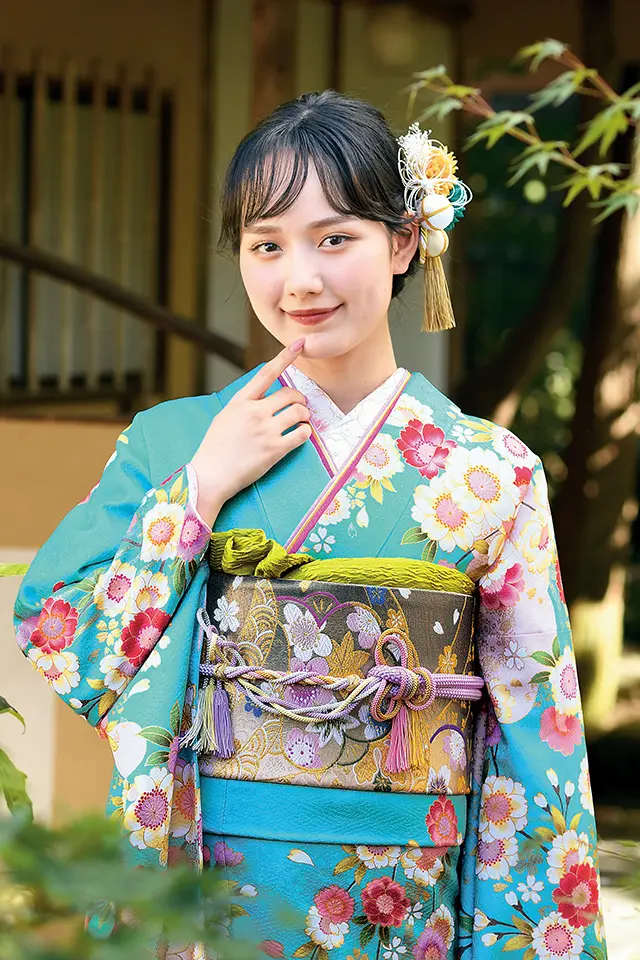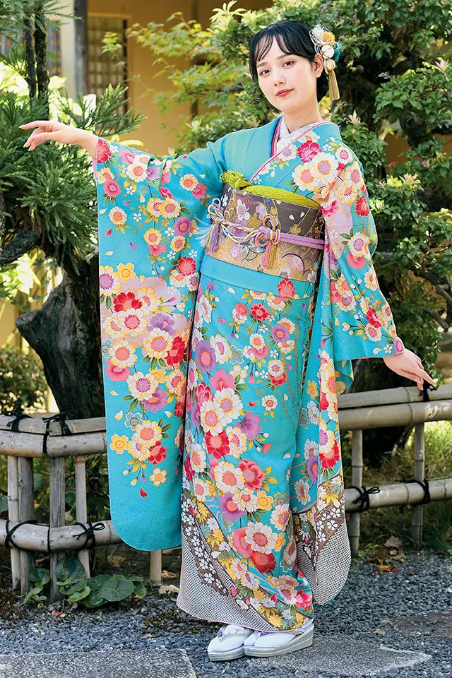 雲一つない青空に八重桜が咲き誇る光景を見上げているかのような振袖です。幾重にも花びらを重ねる姿が美しく、裾に配された疋田模様が全体を引き締め、スタイルアップを叶えます。