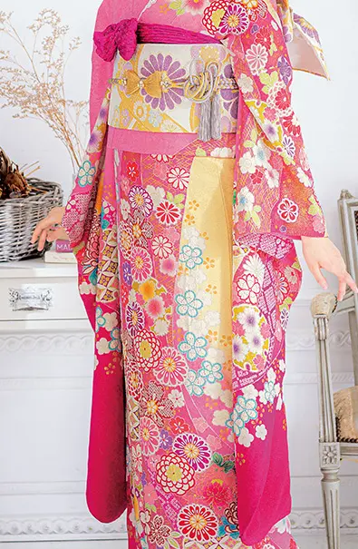 ころんとしたシルエットの菊が全体に配置された、はんなり甘めな振袖です。こよなく愛される桜、百花の魁と呼ばれる梅などたくさんの願いを身にまとい、ロマンティックな世界を楽しんで。