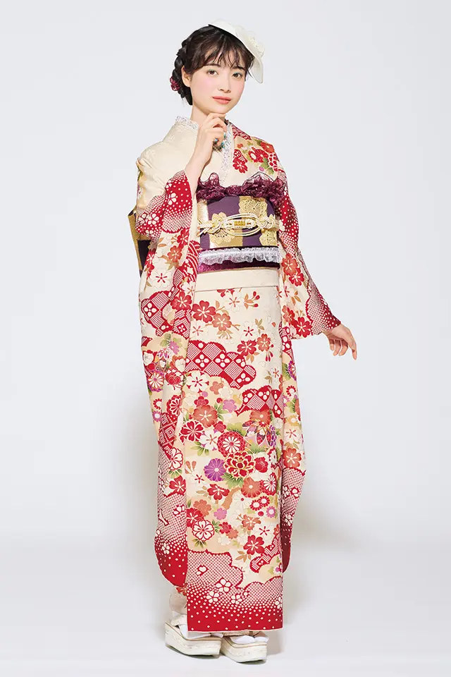 オフホワイトの地色に朱赤を基調とした古典柄や独特な味わいの染疋田を散りばめたレトロ振袖です。流れるような雲取りで全体を斜めに区切り、小ぶりな毬や菊、牡丹などの柄は丸いシルエットが女の子らしいイメージを強調させています。