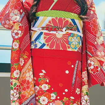 紗綾形地紋が浮かび上がる高級感のある生地に全体を暖かみのある色をメインに構成した王道古典振袖です。所々に差し色として使用した緑の葉が古典美を深めます。雪輪と隣り合わせに配した桜や、菊、紅葉など季節の移ろいを身にまとい、何年経っても色褪せない思い出を。