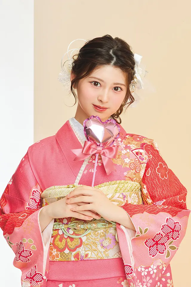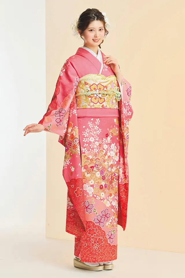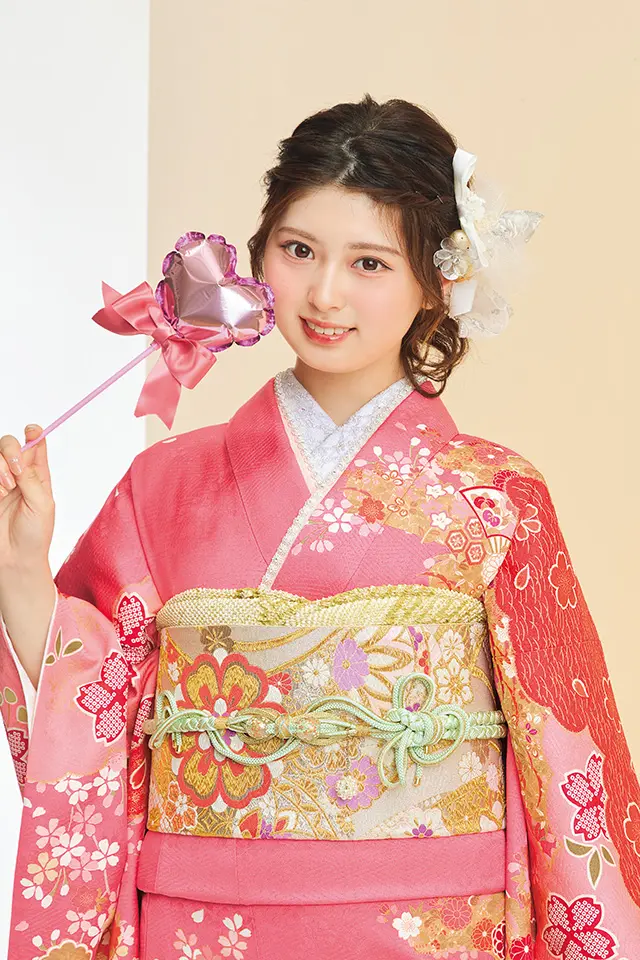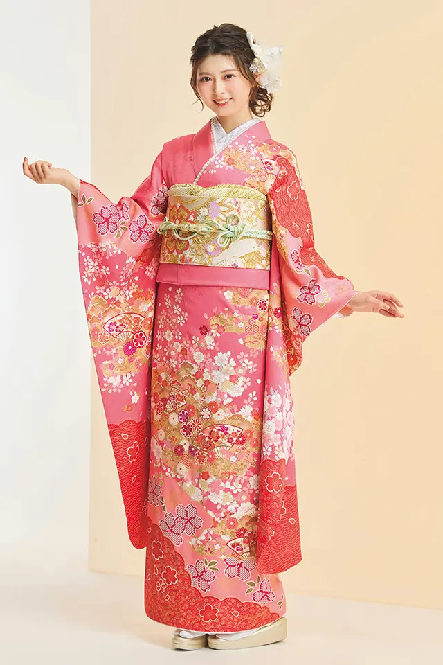 コーラルピンクをメインにチークカラーでまとめ上げた色合いが肌にほんのりとした血色感を与え、イエベさんにオススメの愛され振袖です。末広がりのシルエットが開運を彷彿させる扇面や、古くから愛される桜、永遠を表す流水文様など贅沢に古典柄を敷き詰めています。