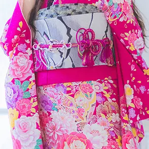 フュッシャーピンクが一目見たら釘付けのドーリーな振袖です。裾の黒いボカシが全体を引き締める効果を生み出し、地色が見えなくなりそうな程に大輪のバラや蝶の柄をふんだんに敷き詰め、周りとは一味違う魅力的な存在をアピール。