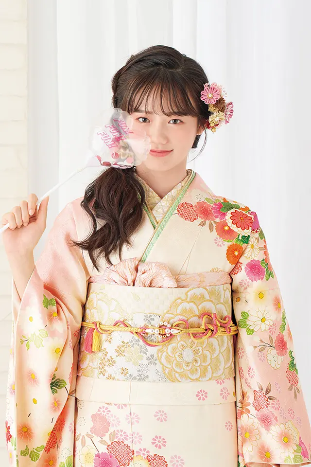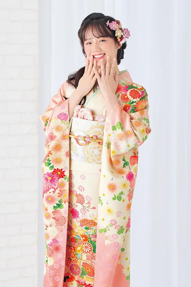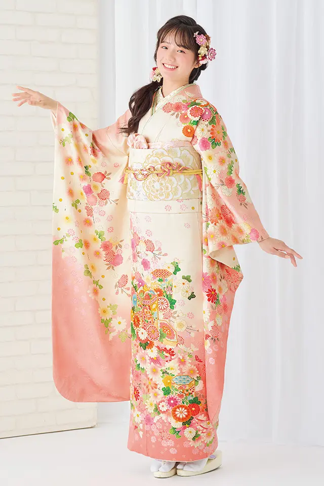 ふんわりとした優しさと、洗練された雰囲気が調和した古典振袖です。華やかさを添える貝桶を取り囲むように咲き誇る四季折々の花々を春カラーでまとめ、寒い冬を耐え開花した暖かな春のぬくもりを感じさせます。