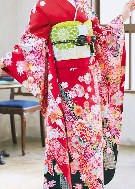 華やかに可愛らしく。丸いシルエットが愛らしい手まりや雪輪が織りなす、乙女古典の完成です。永遠を表す熨斗柄を背景に、『座れば牡丹』と例えられ美しさの象徴とされる牡丹がきらりと華やぐ振袖です。
