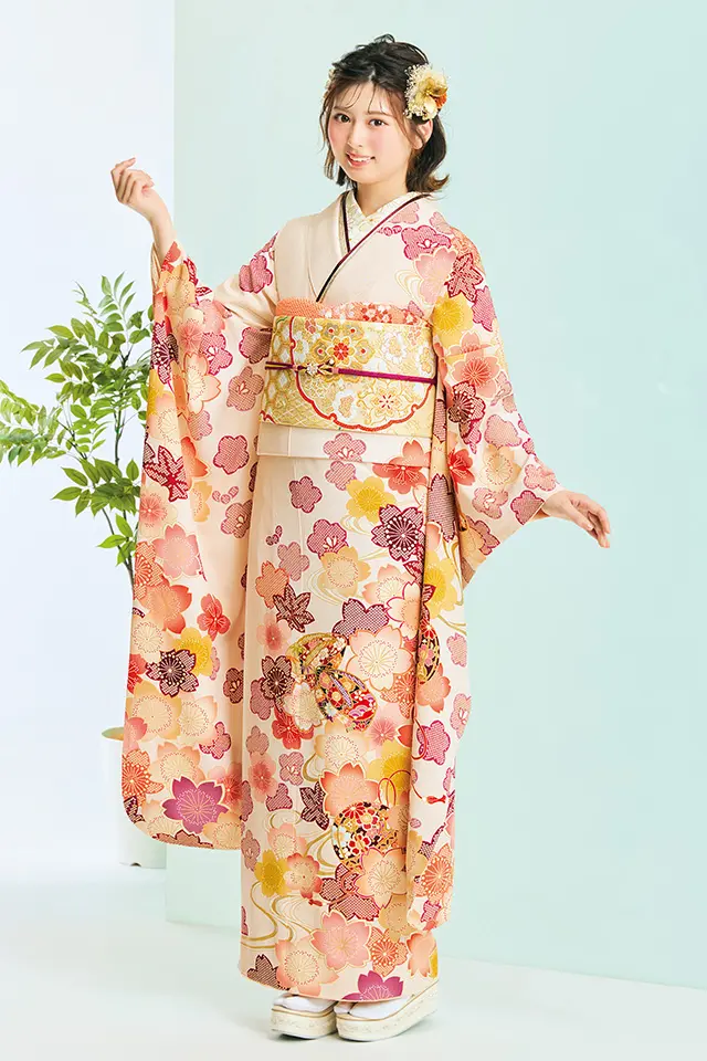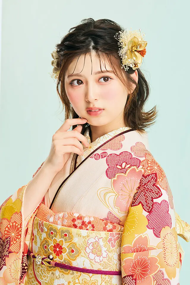 お洋服感覚で振袖選びをしたいお嬢様へオススメのくすみカラー振袖です。暖色系のくすみカラーのみで構成した柄には、敢えて色味を足さず同系色のみでまとめた小物合わせがトレンド感満載です。今しか出来ないスタイルで思い出の1ページに。