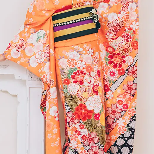 パキっとしたオレンジと袂の特徴的な絞り柄が印象的な振袖