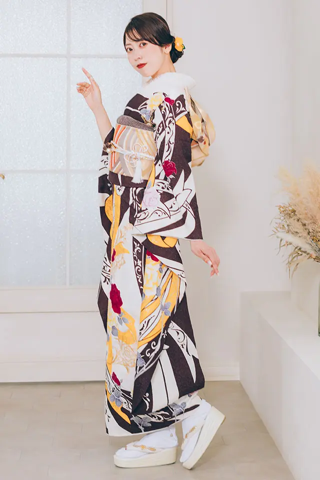 珍しい焦げ茶に地模様が美しい古典振袖。身頃に豪華な金駒刺繍と、桜や菊、絞り模様の熨斗目などが描かれ格調高さがうかがえます。※こちらの商品はお取り寄せとなります。詳しくは店舗へお問い合わせください。