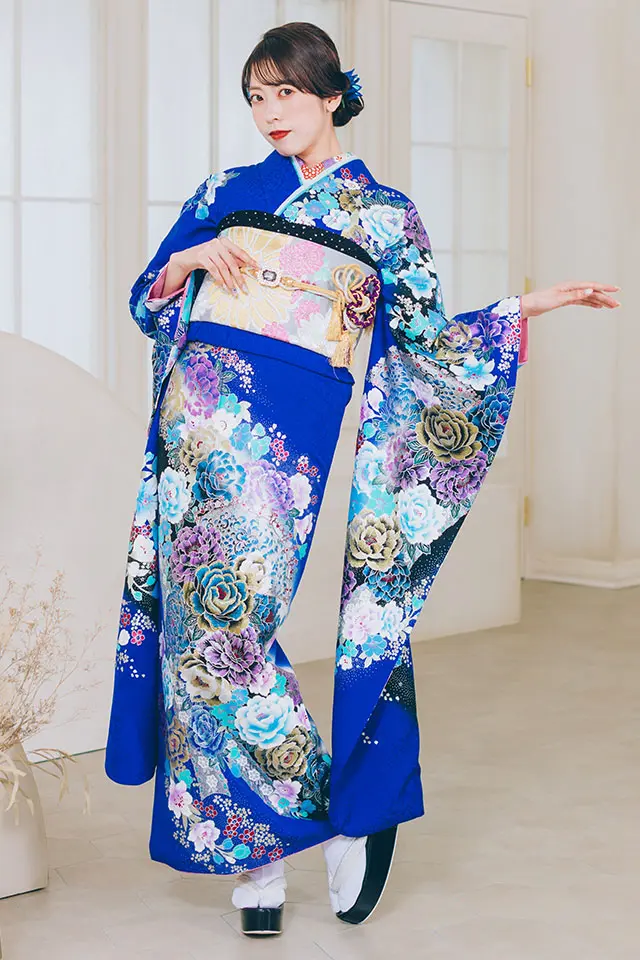 色使いはシックに、柄ゆきは華麗に。洗練を極めたモダンテイストの振袖はドレス感覚でまとえるのも魅力。※こちらの商品はお取り寄せとなります。詳しくは店舗へお問い合わせください。