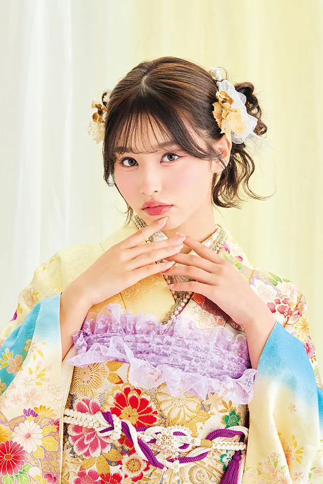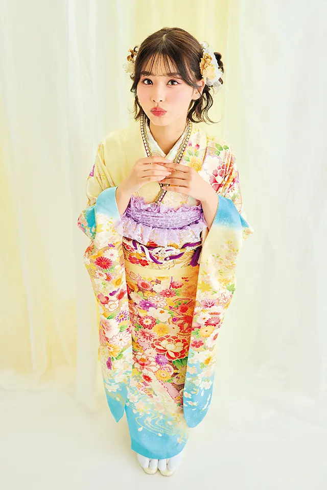 温かみのあるクリームイエローと優しい印象のベビーブルーの組み合わせが以外にも珍しい組み合せの愛らしい振袖です。毬や牡丹など女の子らしさを代表する柄が肩を並べ、パステルカラーを身にまとった姿で主役級の可愛さに。