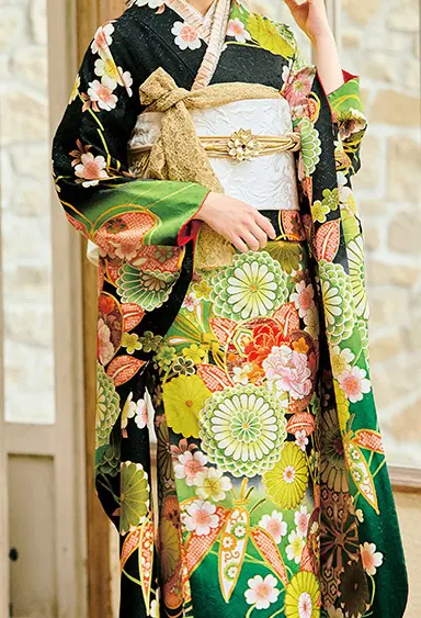 クールな地色と、目が覚めるほどに鮮やかなグリーンの菊が古典美を極める振袖です。ぼかしの技法が全体に爽やかな雰囲気をもたらし、橘の中に暖色で描いた牡丹が女性らしさを忘れません。