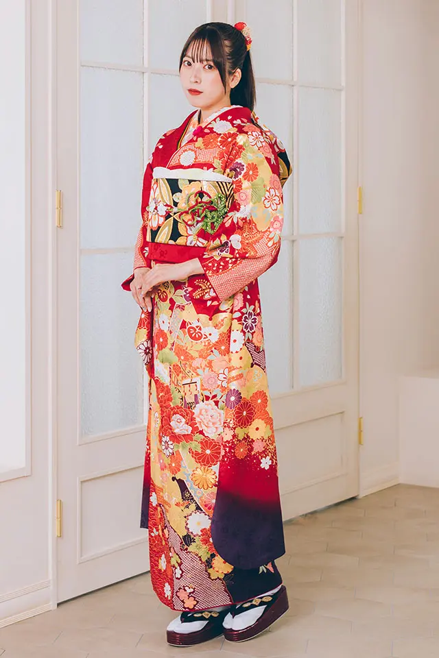 赤と紫の染め分けに、様々な花と金駒刺繍で王道な色味に上品さとゴージャスさをプラスした華やかな振袖です。※こちらの商品はお取り寄せとなります。詳しくは店舗へお問い合わせください。