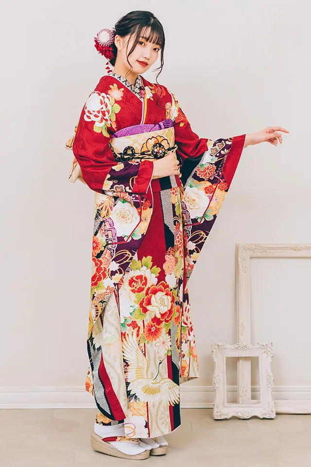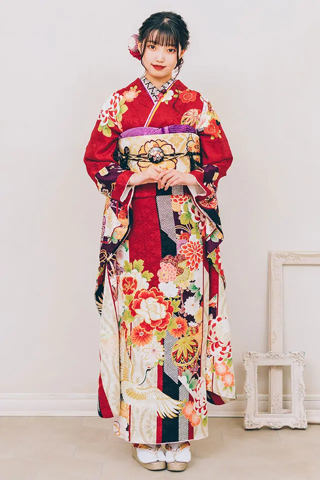 吉祥文様である鶴や手毬が描かれた古典的な振袖です。赤い振袖に黒の疋田柄が施されており、大人っぽい印象を与えてくれる一枚です。※こちらの商品はお取り寄せとなります。詳しくは店舗へお問い合わせください。