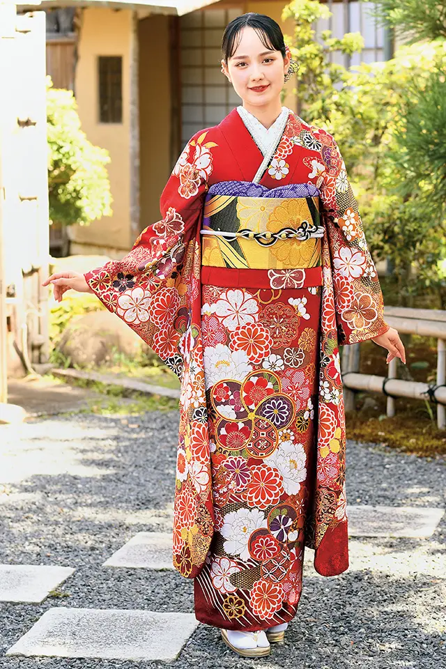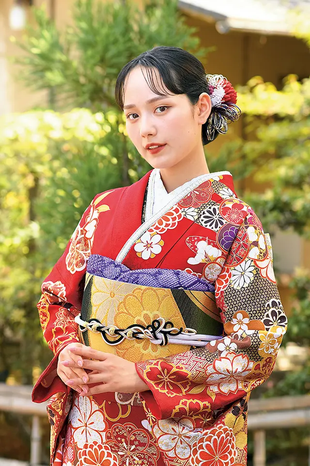 重厚感のある赤地に梅・菊・桜の花々を散りばめています。ポイントに大きなねじり梅を大胆に配しています。また。所々に配した白い牡丹の花と背景に描かれた雲取りの施された紗綾型の金彩がより一層華やかな雰囲気を引き立てます。