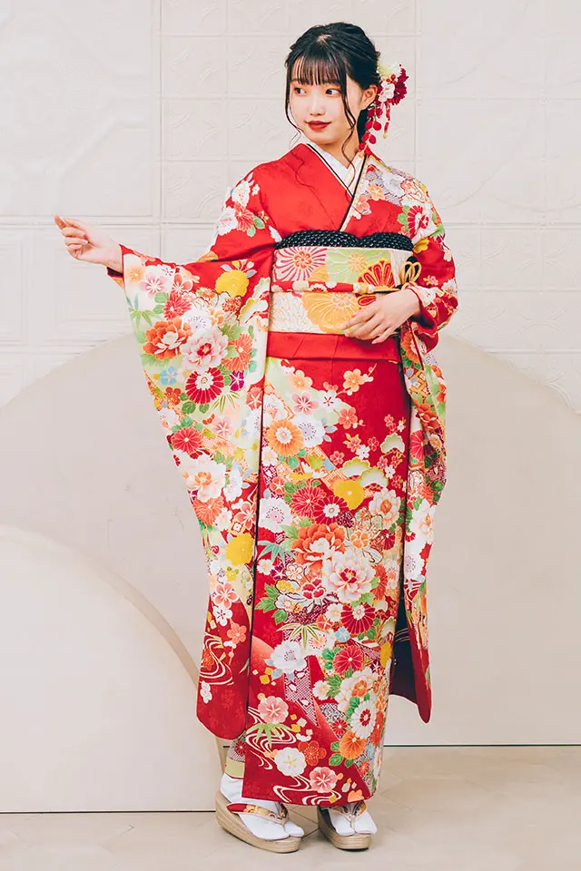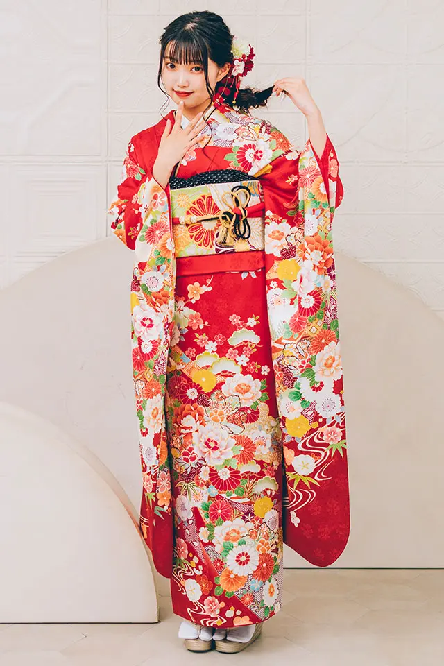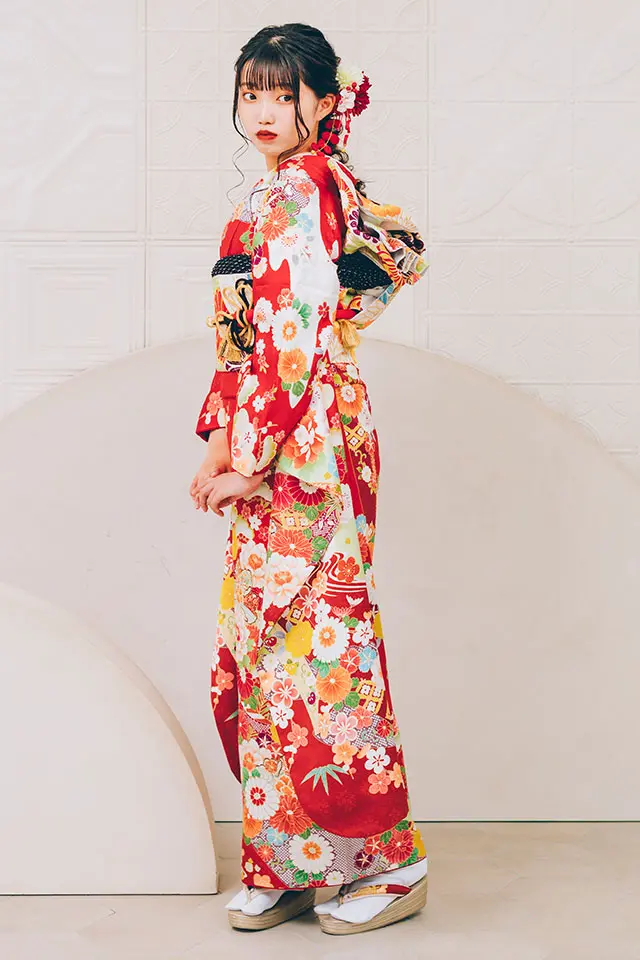 赤の鮮やかさと古典柄が成人式の場に相応しい華やかさを演出