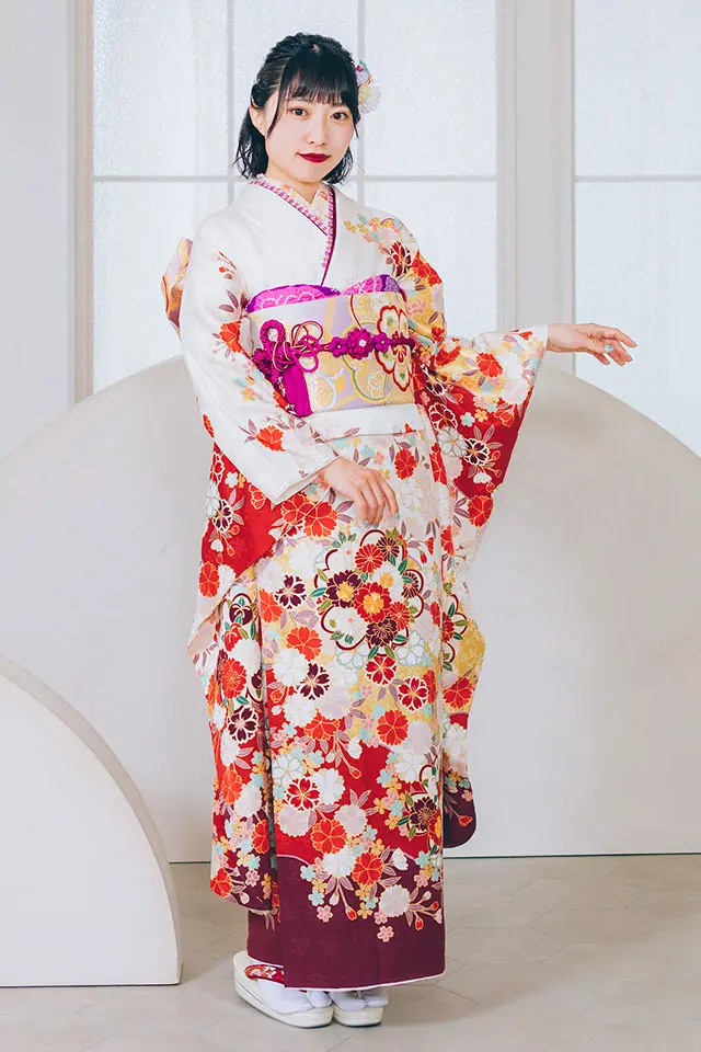 白い地色を覆いつくすほどの牡丹が咲き乱れています。静かな印象の真っ白な地色に暖色系の柄を配し血色感を与えている正統派古典振袖です。※こちらの商品はお取り寄せとなります。詳しくは店舗へお問い合わせください。