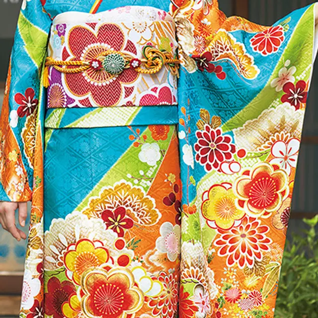 ターコイズブルーの地色にオレンジと黄緑の松葉取りが特徴の柄です。柄の中に疋田や小紋箔が入っています。ポイントの梅や菊の柄は、オレンジや赤の色調でまとめています。ポップなカラーに伝統的な古典柄がマッチした新感覚の古典振袖です。