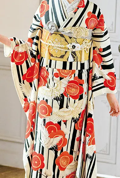 オフホワイトの地に黒の格子柄を背景にして紅梅と飛翔鶴を配しました。コントラストのはっきりした個性あふれる柄に仕上がっています。