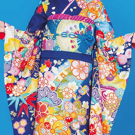 吸い込まれるように鮮やかなブルーに山吹やゴールドなどの明るい差し色をオン。薄いブルーのボカシとともに可憐に咲く八重梅が熨斗柄とともに流れ、穏やかな時間を思わせます。